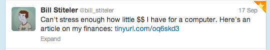 I also follow Stiteler on Twitter. On Sept. 17, he posted a desperate plea for help replacing his seven-year-old MacBook that had died on him. Not only was it inspiring to see the twitter community come to his help within hours, I was also intrigued by this article that he tweeted:
